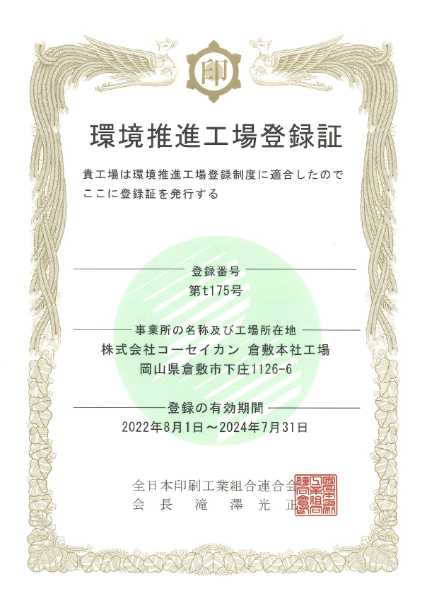 2022年8月、岡山県下に本社を置く印刷会社としては 唯一(2022年8月現在)の「環境推進工場」登録を取得いたしました。